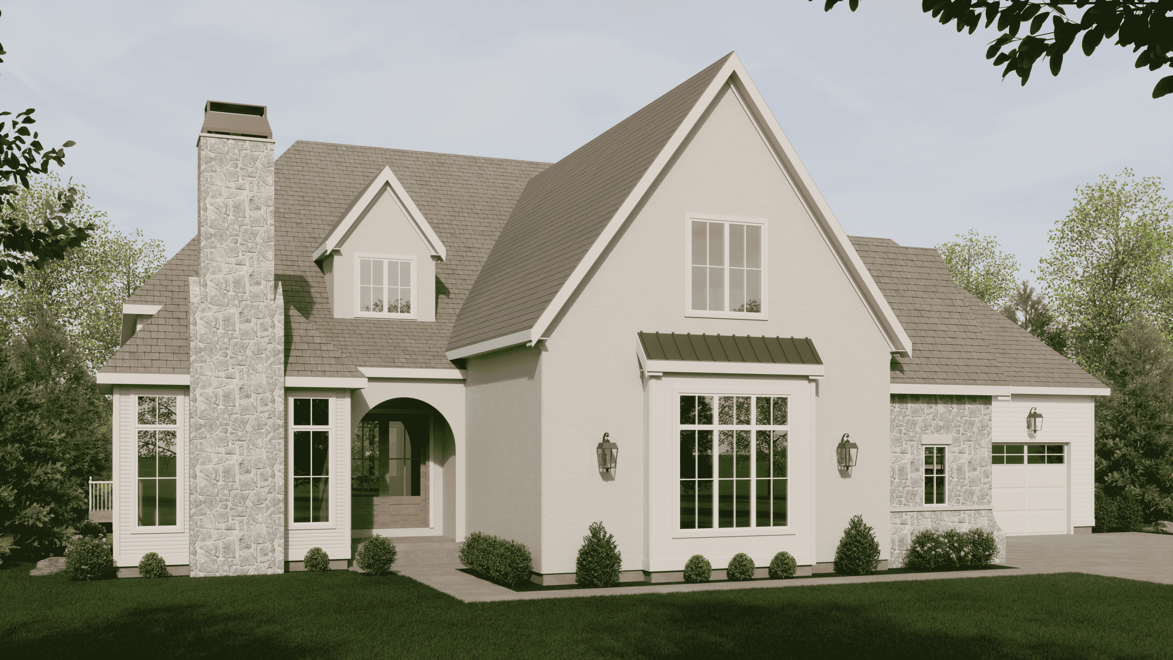 The Persimmon plan offers a story-and-a-half design with the primary suite on the main level. A spacious living area and inviting den showcases a beautiful stone fireplace, enhanced by abundant natural light. Exterior charm abounds with a front-facing chimney, graceful arches, and elegant curved details, creating a home that is as warm and welcoming as it is timeless.