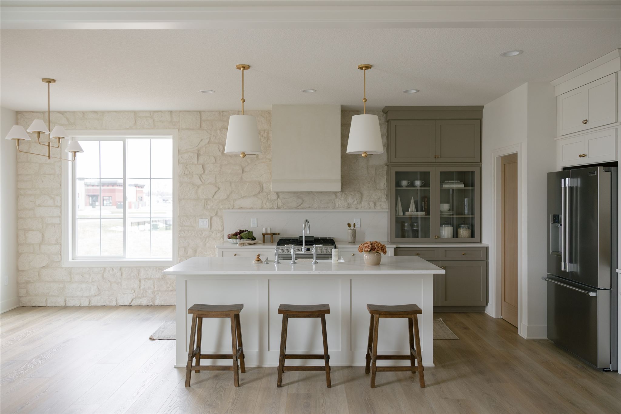 Welcome to 306 SW stunner in the heart of Prairie Trail-5 bedrooms, 3 baths, and 2,776 finished sq ft with a 3-car garage . Step inside to a bright, airy layout with window transoms, warm LVP flooring, and beamed ceilings in the living room. The focal point is a cast stone fireplace with custom detail, flanked by natural light. The designer kitchen pairs style and function with quartz countertops, island seating, a striking stone accent wall, McGee & Co. pendants, custom hood vent, and walk-in pantry. The dining area flows seamlessly to the covered patio and backyard-perfect for entertaining. The primary suite features a vaulted ceiling, walk-in closet, and a spa-worthy bath with 4x4 tile shower and double vanity. The finished lower level adds a spacious family room, two bedrooms, full bath, and abundant storage. All of this is within walking distance to Prairie Trail's best parks, schools, trails, pickleball courts, and The District-a perfect blend of modern design, comfort, and community living.